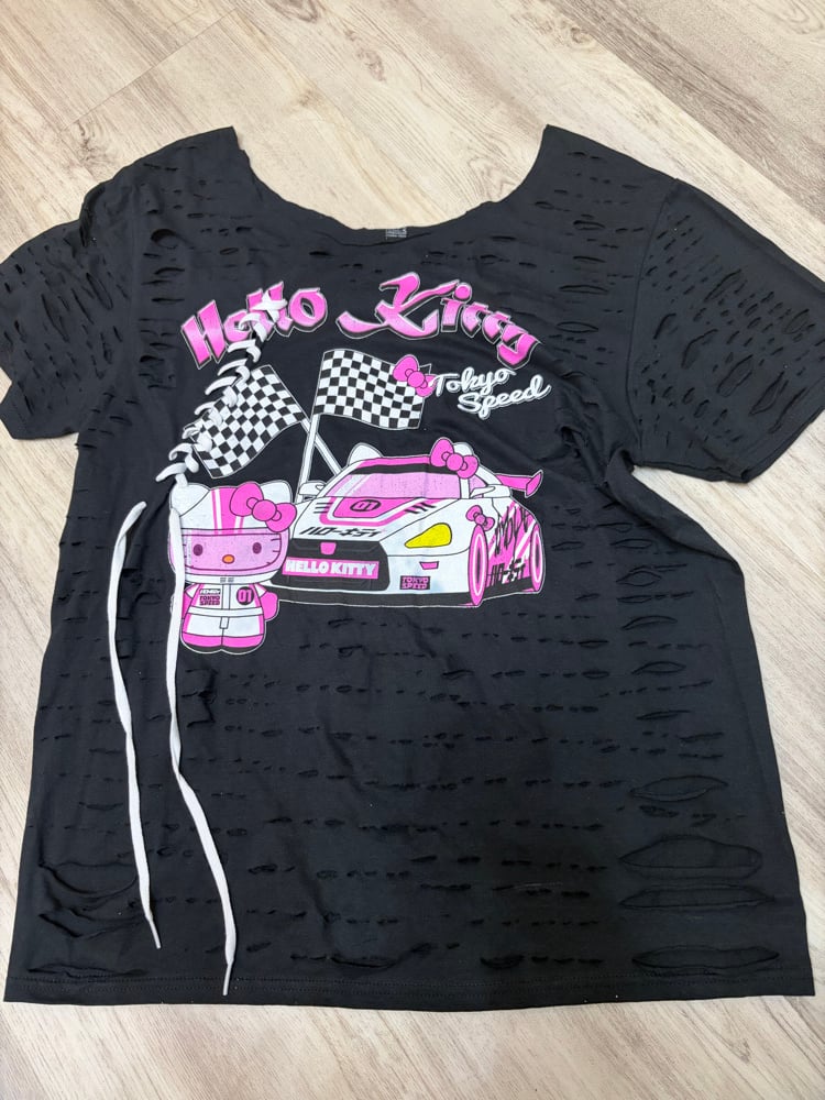 Large kitty checkered off shoulder lace destroyed